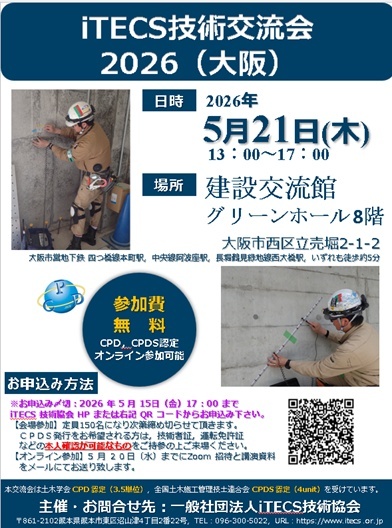 2026年04月24日 (金) 13:07 新着 iTECS技術交流会(大阪)申込みについて 2026年度iTECS技術交流会(大阪)が開催されます。 今年度も対面とオンラインでの開催ですので、関係各位お誘いの上、ご出席ください。 日時:2026年5月21日(木)13:00-17:00 場所:建設交流館(グリーンホール 8階) (大阪市西区立売堀2-1-2) CPD:3.5単位、CPDS:4unit ご参加希望の方は、下記登録フォームにてご登録ください。 申込み登録フォーム [トップに戻る]